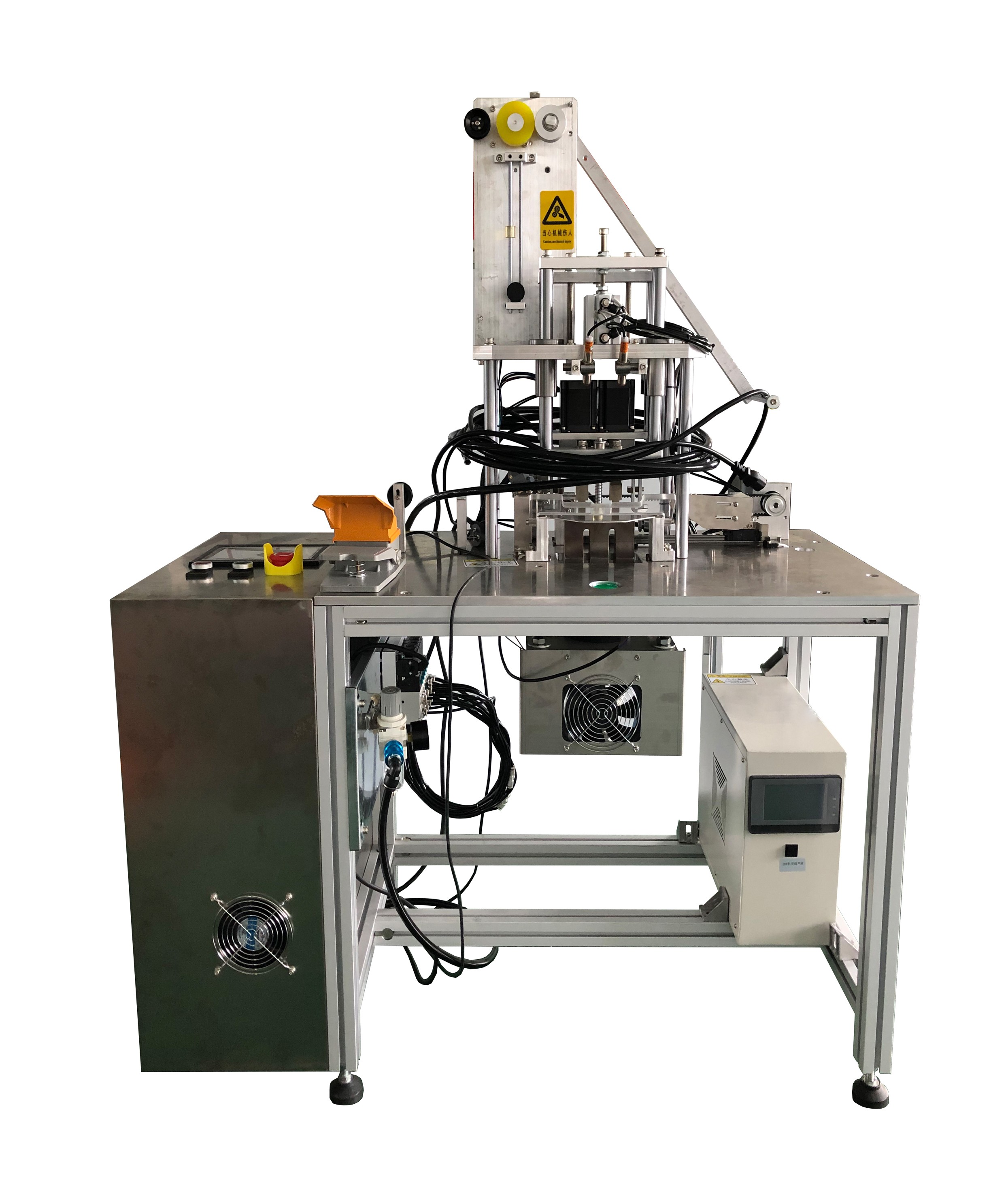 設備采用超音波焊接方式將松緊帶融合于口罩本體外側,是外耳帶口罩生產最后一道工序,僅需一名操作員將口罩本體置放于口罩治具上,后續動作至產品完成由設備自動操作。本機臺采用伺服驅動,步進馬達旋轉,傳動精確,速度可調,性能穩定。
